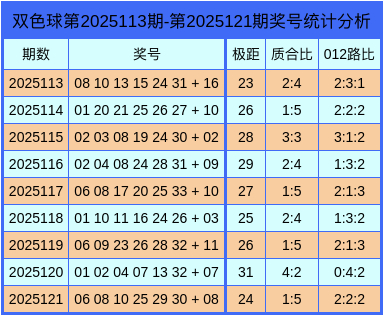 上期回顾:双色球第2025121期回顾:红球06、08、10、25、29、30 + 蓝球08。